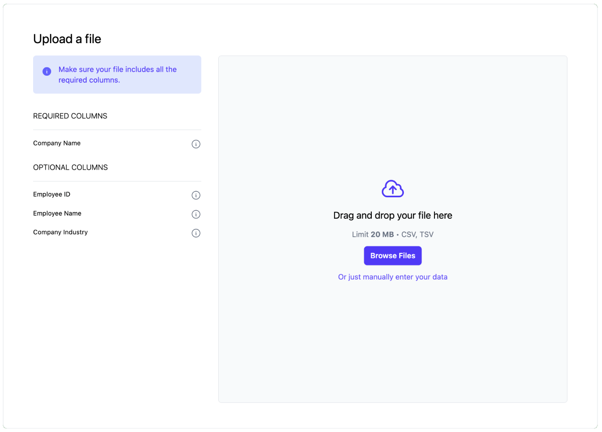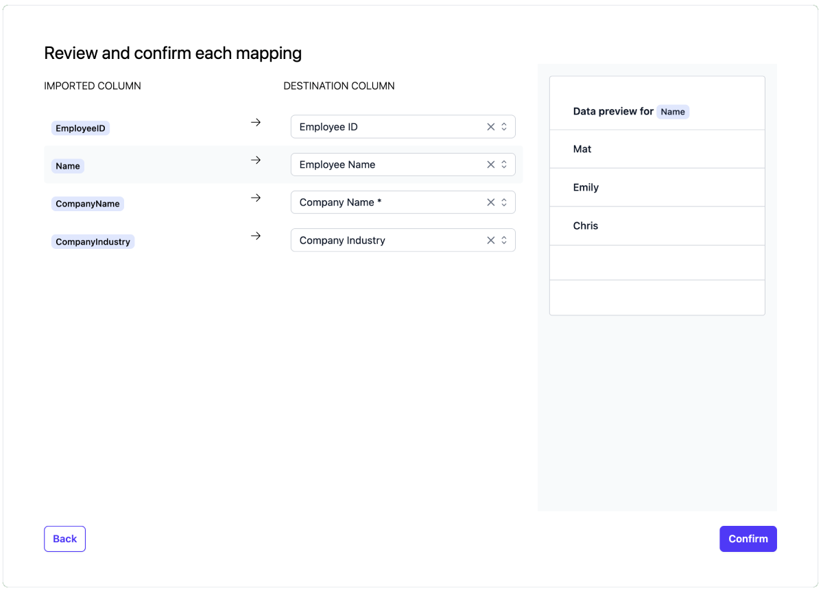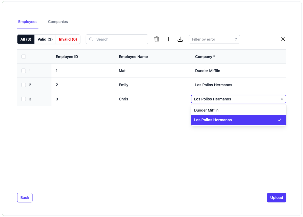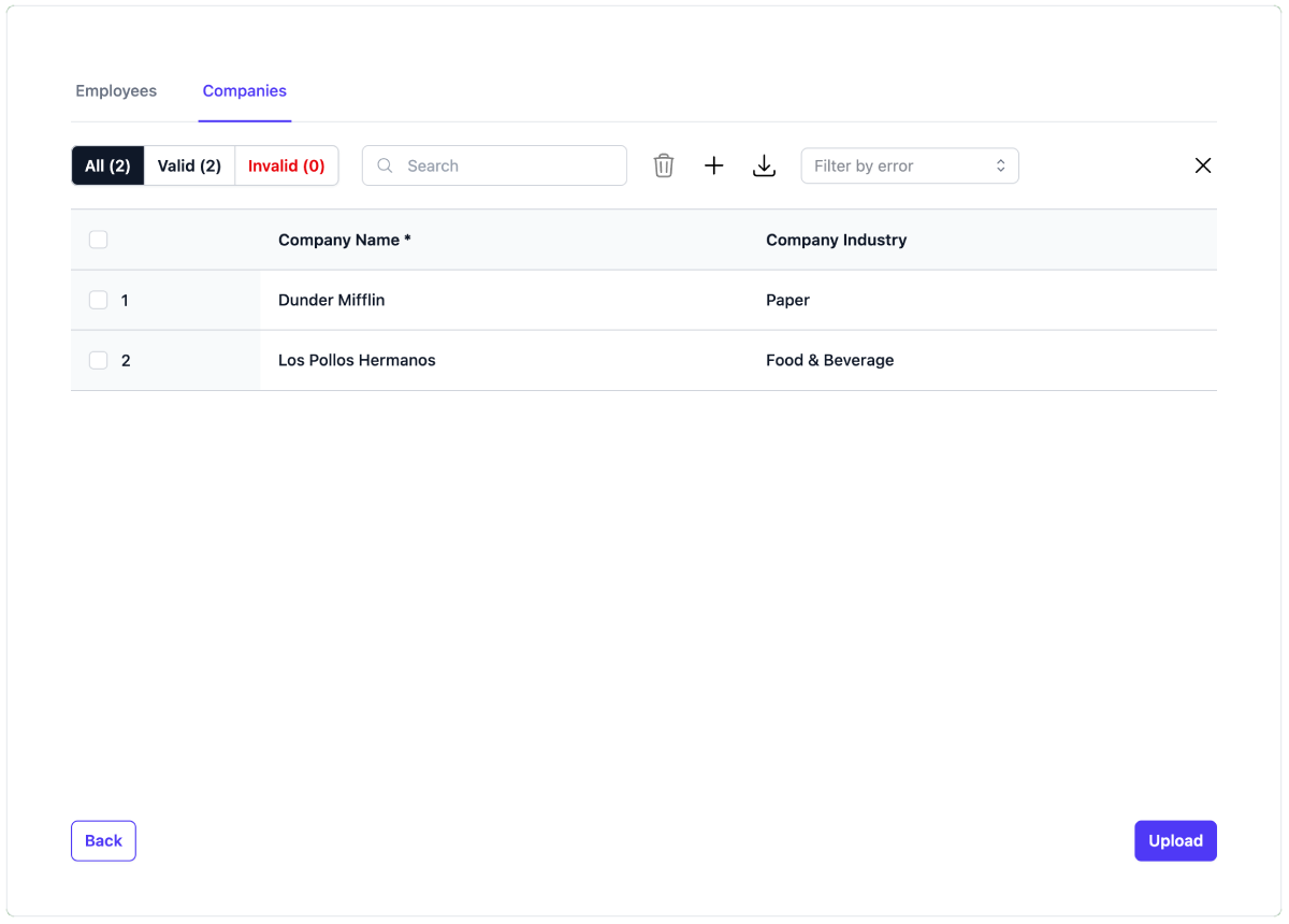Often you’ll want to import data that actually implicitly has multiple data schemas within it. For example, consider importing a CSV of employees working across multiple companies.